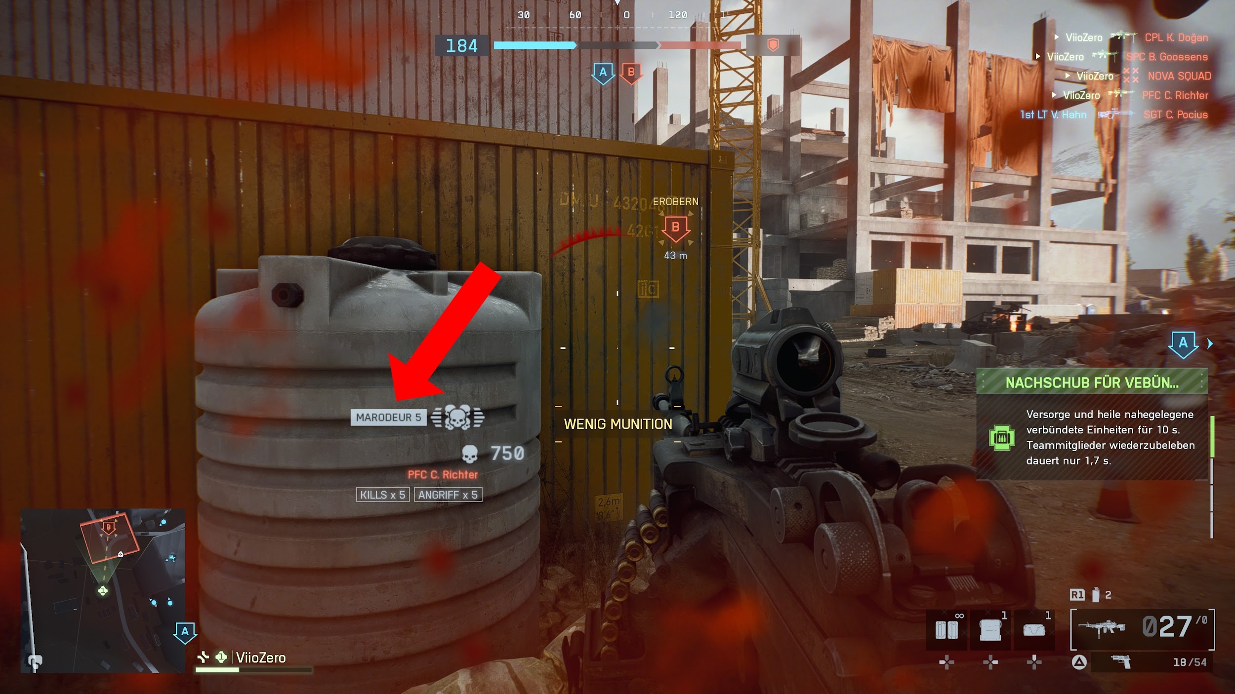 Bei einem Mehrfachkill handelt es sich um fünf Abschüsse in kurzer Zeit. Zwischen den einzelnen Abschlüssen dürfen nicht mehr als 5 Sekunden liegen. Das bedeutet, wenn ihr zwei Gegner eliminiert habt und nun mehr als 5 Sekunden vergehen, wird der Kill-Zähler zurückgesetzt und ihr beginnt wieder bei 0 Kills. Zudem muss die Trophäe mit der Klasse “Sturmsoldat” erspielt werden. Hierbei ist es nicht zwingend notwendig, dass ihr zu Fuß lauft. Ihr könnt somit Panzer, Flugzeuge und Helikopter verwenden. Möchtet ihr die Trophäe jedoch zu Fuß erspielen, empfiehlt es sich, hier ein LMG auszurüsten, welches mindestens 100 Schuss umfasst. Grund hierfür ist, dass die Nachladezeit andernfalls zu lang dauert und die fünf Sekunden verstreichen. Ob ihr einen Mehrfachkill durchgeführt habt, erkennt ihr in der Mitte des Bildschirms an dem Schriftzug “Marodeur”. Erscheint dieser hier, wurden fünf Kills in schneller Abfolge durchgeführt. Im folgenden ein Bild hierzu: