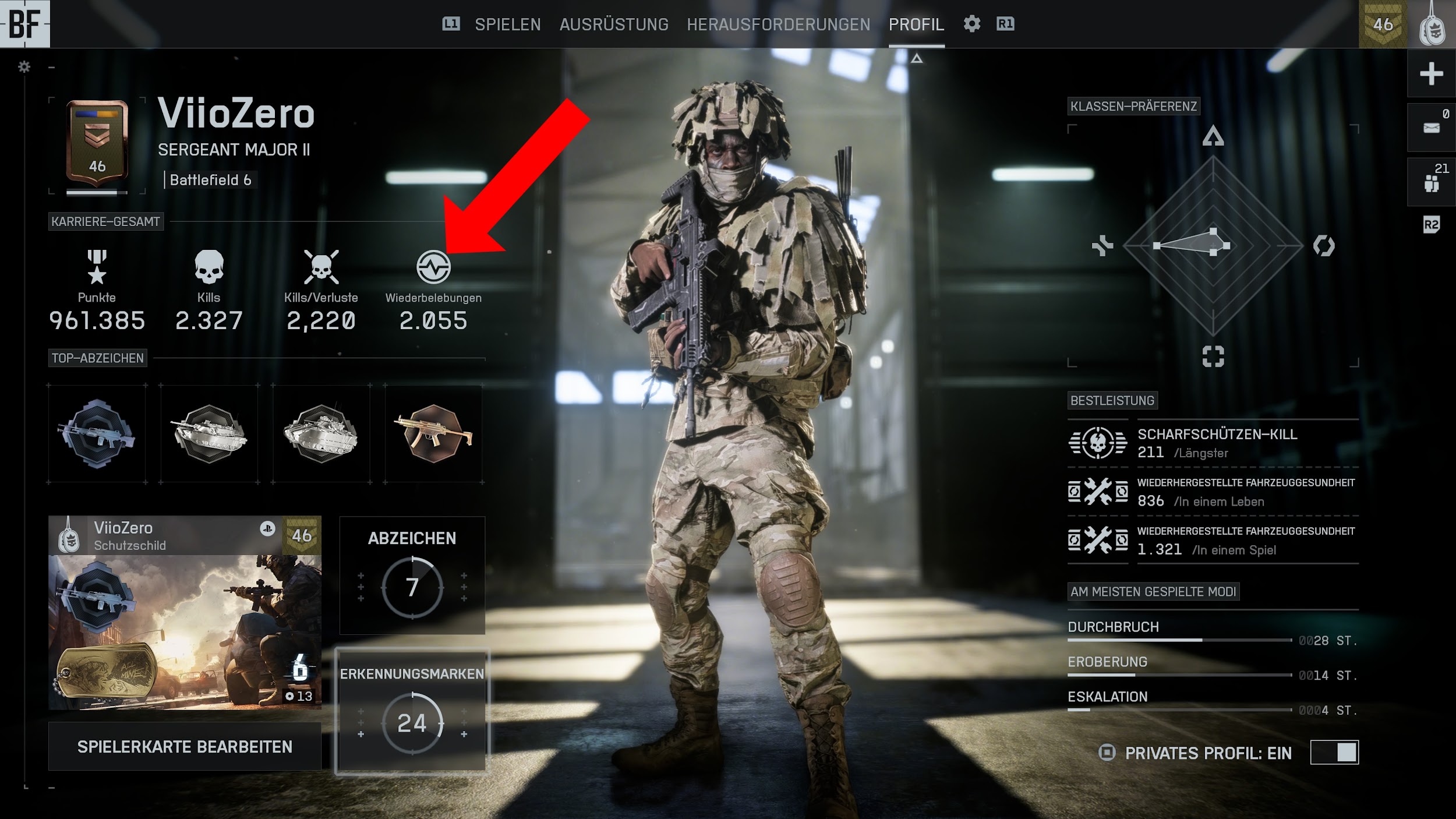 Euren Fortschritt könnt ihr zudem jederzeit überprüfen. Drückt hierfür, während einer laufenden Runde, die Options-Taste und wechselt nun auf den Reiter “Profil”. Alternativ könnt ihr dies ebenso im Hauptmenü überprüfen. Auch hier müsst ihr in den Reiter “Profil” wechseln. Anschließend könnt ihr am linken Bildschirmrand den Punkt “Wiederbelebungen” erkennen. Im folgenden ein Bild hierzu: